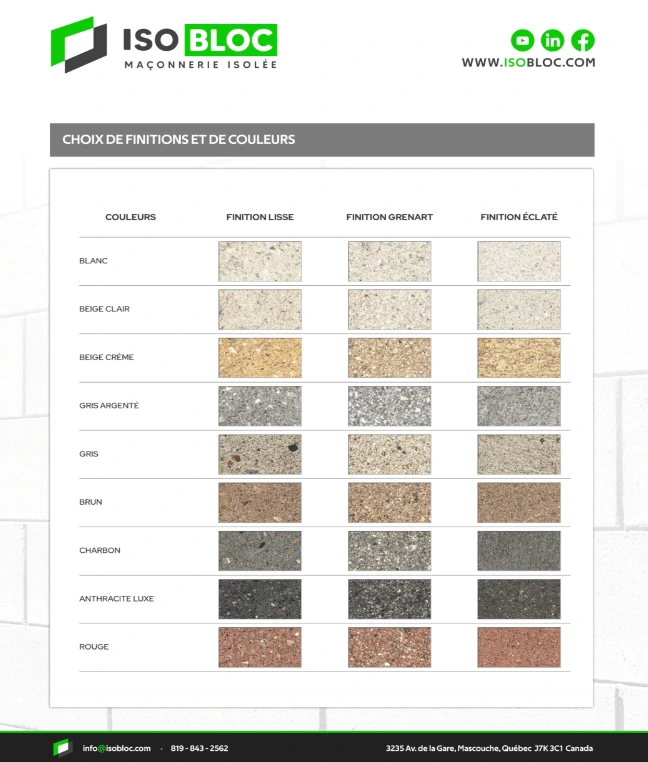 three types of finishes (solid, split surface, and granulated). For now, Isobloc Zero is offered in a single color due to the difference in raw materials used.