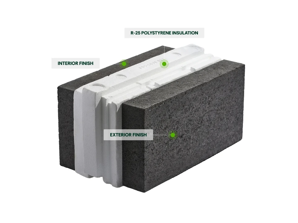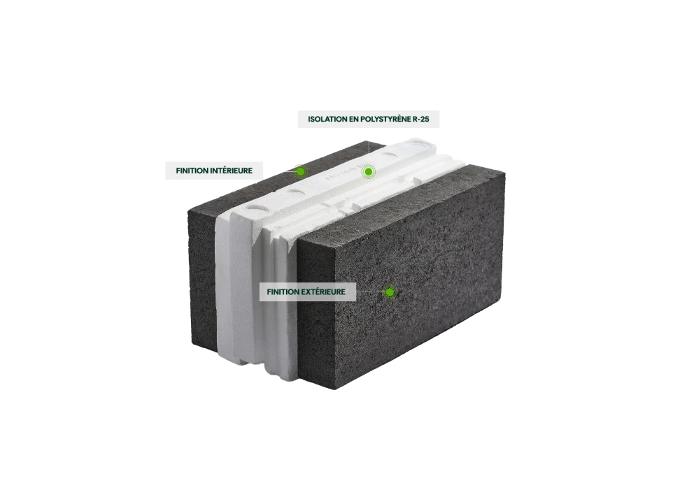 The wall offers an effective R-25, without thermal bridges, thanks to its perfectly continuous type 22 expanded polystyrene core.